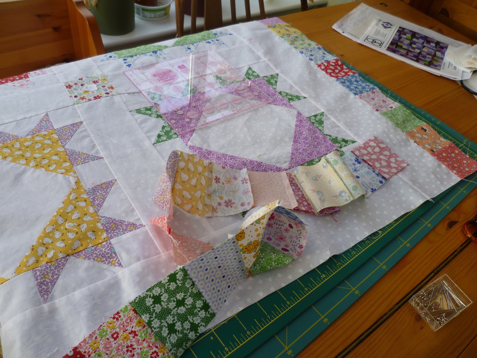 Then one of my favourite parts of making a large quilt. Pushing all the furniture back in the dining room and spreading the blocks around and playing with them, shuffling the rows until the colours and patterns all sit together nicely...